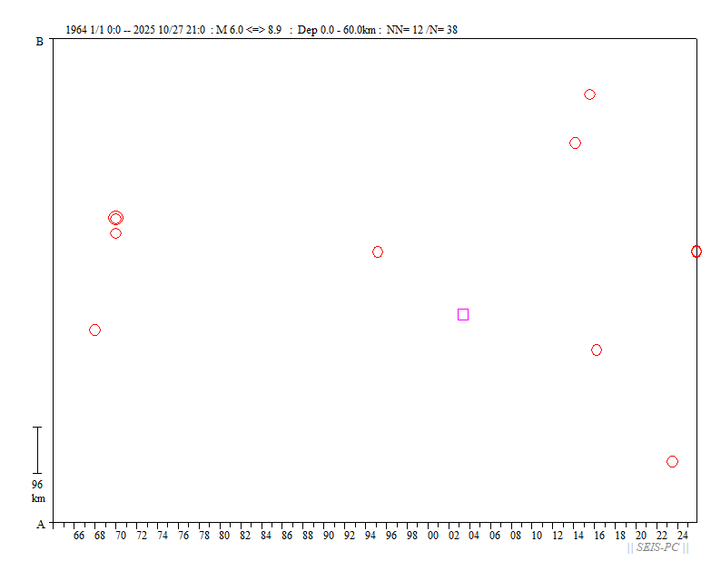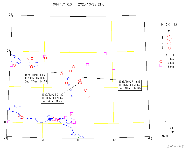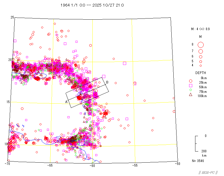グアドループ島東方沖のM6.5地震(2025年10月27日) ![]() 図1:米国地質調査所の震源データによる1964年1月1日から2025年10月27日(世界標準時)まで、 深さ60kmまでM6以上の震源分布図。今回の地震は、パラメータを右側に示した。 付近で起きたM7を越える地震はパラメータを左側に示した。 ![]() 図2:図1の枠内の震源を時空間分布図で示した。M6.0の余震も起きている。 ![]() 図3:米国地質調査所の震源データによる1964年1月1日から2025年10月27日(世界標準時)まで、 深さ100kmまでM4以上の震源分布図。 ![]() 図4:図3の枠内の震源を直線ABに沿って断面図を示した。 南米プレートがカリブプレートの下へ沈み込んでいる。 戻る |