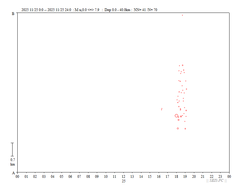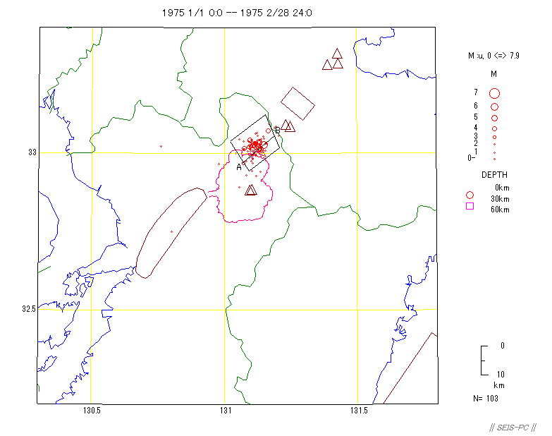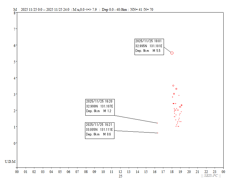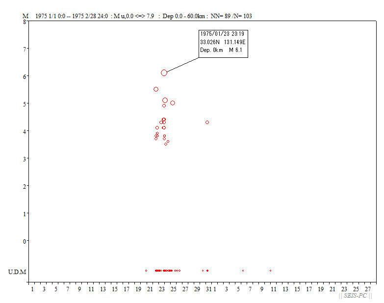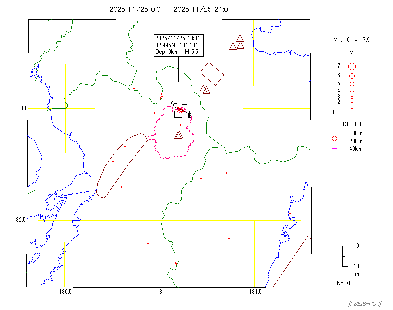 阿蘇外輪山の地震(2025年11月25日、M5.7) ![]() 図1:Hi-net自動処理震源データによる2025年11月25日00時から19時(日本標準時)まで、 深さ40kmまでMすべての震源分布図。 茶色三角印は火山、茶色で囲った領域は2016年熊本地震、1975年大分県中部地震の震源域。ピンク色の線で示したのは阿蘇カルデラの外輪山。 今回の地震は、北部の外輪山で発生している。Hi-netでは本震はM5.5。JMAはM5.7。 ![]() 図2:図1枠内の震源の時空間図。上側が東。前震が2個起きていた。 ![]() 図3:図1枠内の震源のマグニチュードの時間分布図。2個の前震のアラメータも示した。 ![]() 図4:1975年に外輪山北部で顕著な地震活動があった。JMA震源データ(1975年1月1日から2月28日(日本標準時)まで)を示した。 ![]() 図5:図4枠内の震源のマグニチュードの時間分布図。最大地震は、M6.1。 戻る |
