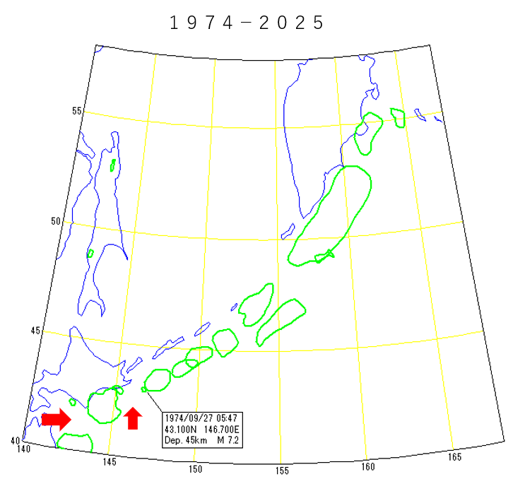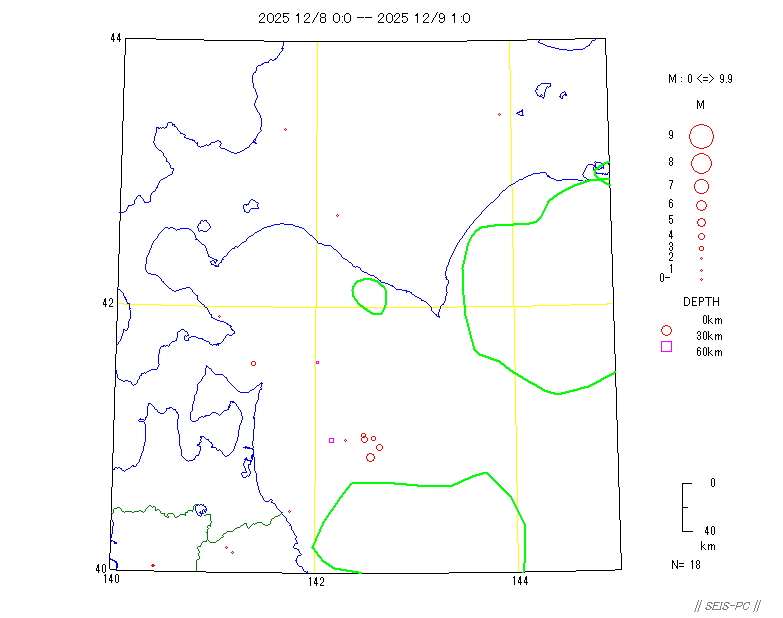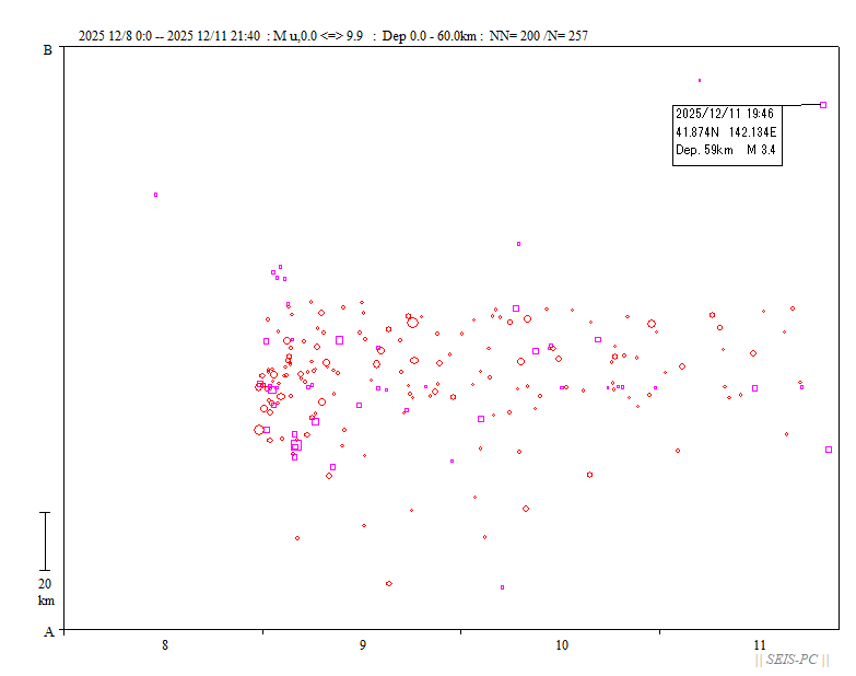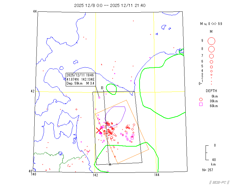 青森県東方沖地震(2025年12月8日、M7.6) ![]() 図1:千島弧の地震空白域と思われる地域(赤色矢印で示した、静岡大学での研究会で発表、10月18日)。 緑線で囲った領域は過去の大地震の震源域(1974年から2025年11月まで)。 釧路沖はやや疑問がある。 ![]() 図2:Hi-net自動処理震源データによる2025年12月8日00時から9日01時(日本標準時)まで、 深さ40kmまでMすべての震源分布図。 茶色三角印は火山、緑色で囲った領域は1994年三陸はるか沖地震と2003年十勝沖地震の震源域。 今回の地震は、この二つの大地震の震源域の間で発生しているようである。 襟裳岬の西の緑線で小さく囲った領域は、1982年M7.1浦河沖地震の震源域。 Hi-net自動震源では本震は結局、決まっていない。JMAはM7.5。 ![]() 図3:Hi-net自動処理震源データによる2025年12月8日00時から11日21時(日本標準時)まで、 深さ40kmまでMすべての震源分布図。 ×印は、USGSによる本震の位置。オレンジ色で囲った四角は、1968年十勝沖地震の震源断層。 今回の地震は、1968年十勝沖地震の震源断層の中央部を破壊したように見える。 南部は,1994年三陸はるか沖地震で破壊されており、残された北部が注目される。 北部に紫色で囲った領域は、1968年十勝沖地震M7.9が起きた約10時間後に起きた最大余震M7.5の震源域である。今回の余震活動が、この領域でほとんど起きていないので、今後、この地域で大きな余震が起きることが危惧される。 ![]() 図4:図3の黒線で囲った震源の時空間分布図。北部で11日19:46にM3.4の地震が起きており、北側の活動が危惧される。 戻る |